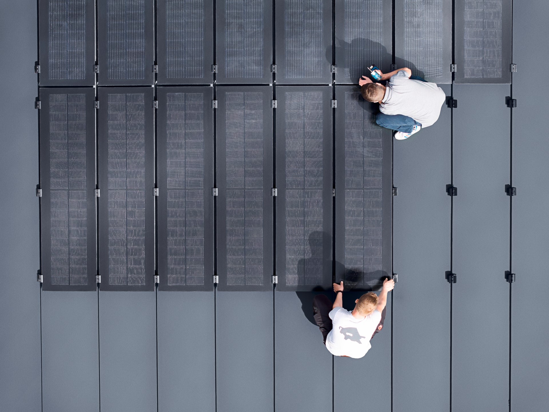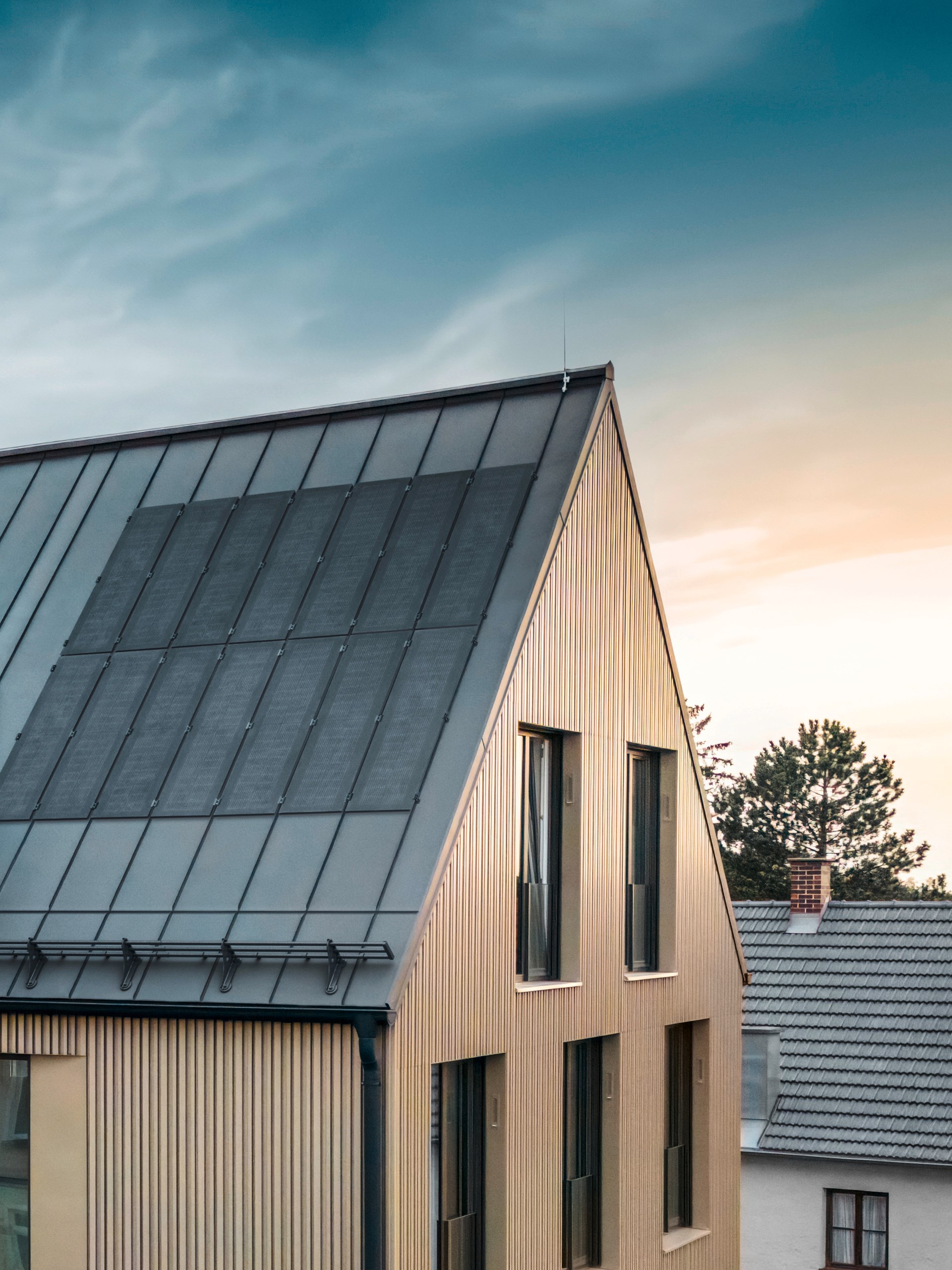 Le système PREFALZ combine modules photovoltaïques verre/verre et fixations en un seul produit, directement posés sur les joints debout. Il permet une installation parallèle au toit avec hauteur minimale, respectant les lignes épurées et l’esthétique des bandes caractéristiques du joint debout.