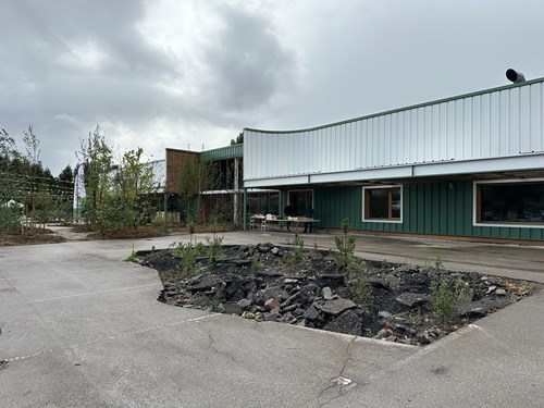 Véritable pivot du dispositif, une ressourcerie de chantier a pris place sur site. Utilisée comme plateforme logistique et comme base de réflexion, elle a servi à inventorier, transformer et stocker les matériaux issus de la déconstruction avant leur réemploi. Comme pour les bardages métalliques de l’ancien supermarché, redessinés pour former de nouvelles façades ou pour les bétons concassés qui ont trouvé un nouvel usage dans les bordures paysagères et les sols stabilisés. Cette chaîne courte, où la ressource reste sur le périmètre d’origine, constitue un modèle de boucle locale de valorisation, limitant les transports et les approvisionnements neufs.