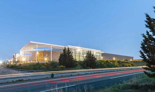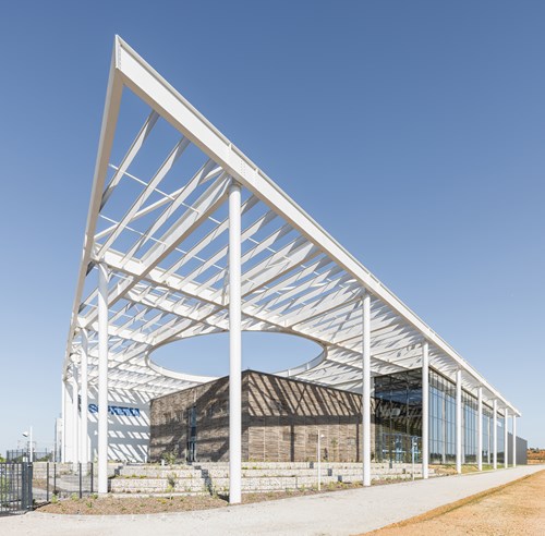 C’est un lieu qui croise architecture et innovation technologique. Il s’agit de l’usine PU Soprema de Saint-Gilles. Un projet qui a été réalisé par Ateliers A+ et qui vient d’être livré. Le programme est complexe. Il a fallu créer une usine de fabrication d’isolant polyuréthane (PU) comprenant une halle de production et des locaux annexes, trois halles de stockage de produits finis et un pavillon abritant des bureaux et des vestiaires. L’ensemble est visible de loin. Il se caractérise par la longueur de sa façade qui fait 250 mètres, son auvent monumental en acier et ses façades vitrées, ce qui le différencie d’autres bâtiments industriels. Malgré le programme exigeant, l’écriture architecturale est fine, elle joue avec le rythme, la transparence, la lumière et la mise en scène des espaces. Des panneaux photovoltaïques cristallins habillent sa toiture et assurent la production d’énergie solaire dédiée à l’autoconsommation du site, participant à une démarche de transition énergétique. Il s’agit, encore une fois, d’un projet conséquent que Ateliers A+ a mené avec habileté pour un résultat remarquable.