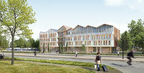 Le Technicampus SNCF Voyageurs se trouve dans la ville du Mans. C’est un projet qui est en cours de réalisation et sera livré en 2026. Situé au Sud de la ville, non loin de la gare ferroviaire, le nouveau campus SNCF prend place dans un environnement verdoyant avec une trame verte qui traverse littéralement le projet tout en faisant le lien entre les entités du programme. Le bâtiment de formation, qui marque l’entrée du campus, se distingue par le traitement de ses façades en bois et en épines en diagonale ainsi que la transversalité de son hall et son escalier monumental. Sur la même parcelle, on trouve un bâtiment d’hébergement ainsi qu’un atelier. Les diverses entités se glissent avec tact dans leur environnement végétal, elles en prennent part. Les lieux de vie et de détente se croisent. L’écriture architecturale s’inspire de l’architecture locale du centre de la France et ses bâtiments à colombage aux toitures marquées. Les architectes ont choisi le système constructif mixte en bois béton, d’une part pour se rapprocher de l’héritage local et d’autre part pour la grande liberté offerte quant à l’aménagement, à la réversibilité et à l’évolutivité des bâtiments. La construction est ambitieuse. Elle répond favorablement à la volonté de construire et d’affirmer des paysages forts, ainsi que le respect de la biodiversité par sa transparence sur les jardins au cœur du campus. Le centre national de formation à la maintenance des trains, qui comprend un bâtiment d’hébergement avec 75 chambres et un restaurant, un bâtiment tertiaire de formation, un atelier et un aménagement des espaces extérieurs, est un programme conséquent et complexe qui, une fois terminé, promet d’être remarquable.