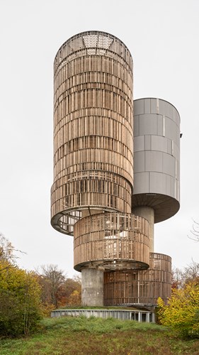 Implanté dans une forêt du réseau Natura 2000, qui couvre l’Europe centrale. Initialement pensé comme un simple réservoir d’eau de 1 000 m³ et 50 mètres de haut, installé dans une clairière protégée en bordure du quartier du Kirchberg, le projet a rapidement pris une dimension écologique supplémentaire lors que les architectes ont suggéré d’y intégrer un refuge pour la faune. “C’est le premier château d’eau élaboré selon une démarche à la croisée de l’architecture, de l’ornithologie et de la botanique. L'objectif est de fournir des solutions concrètes de refuge et de nidification pour différentes espèces, en leur permettant de cohabiter harmonieusement”, explique le porte-parole de Temperaturas Extremas Arquitectos. Le projet s’appuie sur la verticalité de la tour, avec un plan circulaire qui lui permet de s’insérer naturellement dans la forêt. Les concepteurs sont partis d’un principe simple et ingénieux : transformer l’infrastructure en « un arbre de plus dans la forêt ». Pour alléger son impact visuel, la construction est divisée en deux volumes distincts : un premier cylindre en béton brut préfabriqué qui se fond dans les textures naturelles et abrite des nids pour hirondelles et faucons, positionnés à différentes hauteurs et orientations.