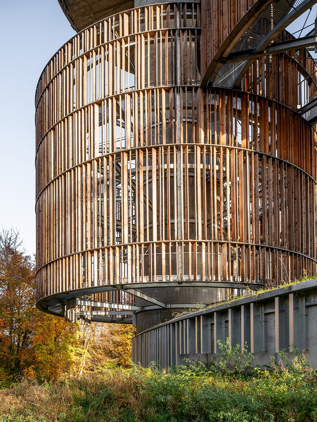 Implanté dans une forêt du réseau Natura 2000, qui couvre l’Europe centrale. Initialement pensé comme un simple réservoir d’eau de 1 000 m³ et 50 mètres de haut, installé dans une clairière protégée en bordure du quartier du Kirchberg, le projet a rapidement pris une dimension écologique supplémentaire lors que les architectes ont suggéré d’y intégrer un refuge pour la faune. “C’est le premier château d’eau élaboré selon une démarche à la croisée de l’architecture, de l’ornithologie et de la botanique. L'objectif est de fournir des solutions concrètes de refuge et de nidification pour différentes espèces, en leur permettant de cohabiter harmonieusement”, explique le porte-parole de Temperaturas Extremas Arquitectos. Le projet s’appuie sur la verticalité de la tour, avec un plan circulaire qui lui permet de s’insérer naturellement dans la forêt. Les concepteurs sont partis d’un principe simple et ingénieux : transformer l’infrastructure en « un arbre de plus dans la forêt ». Pour alléger son impact visuel, la construction est divisée en deux volumes distincts : un premier cylindre en béton brut préfabriqué qui se fond dans les textures naturelles et abrite des nids pour hirondelles et faucons, positionnés à différentes hauteurs et orientations.