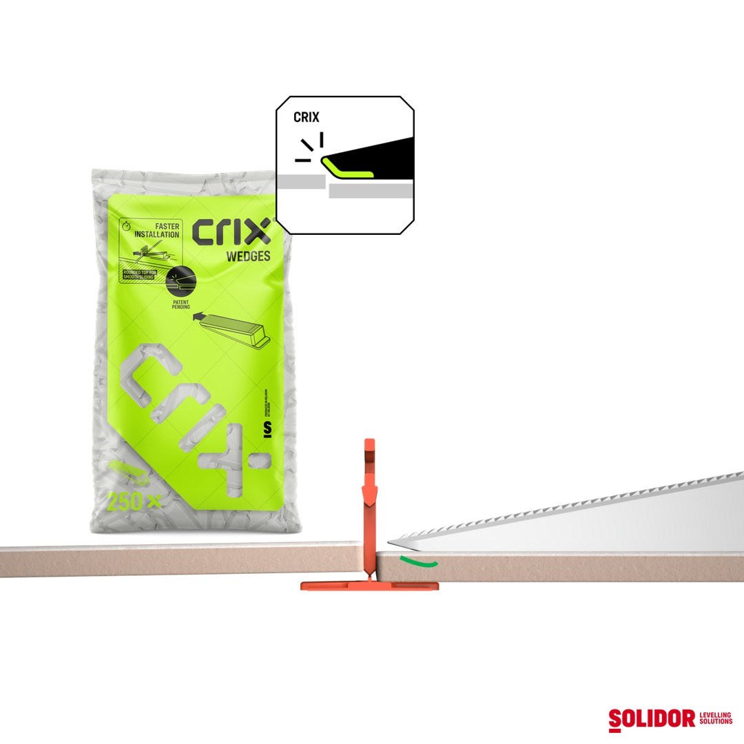 En 2025, SOLIDOR a élargi son assortiment avec des solutions innovantes telles que CRIX, le nouveau système de nivellement composé d’une cale brevetée, d’une pince à carrelage, de croisillons et de clips de différentes couleurs. Ces couleurs permettent de distinguer facilement les différentes épaisseurs.