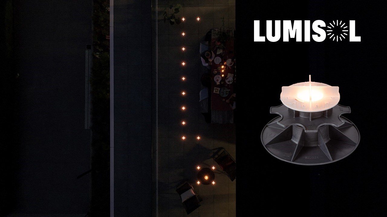 SOLIDOR a également lancé Lumisol, la première plaquette lumineuse au monde, également brevetée. Cette plaquette peut être combinée avec tous les plots du gamme Comfort. La lumière diffuse traverse subtilement les joints entre les dalles et crée une lueur chaleureuse et architecturale.