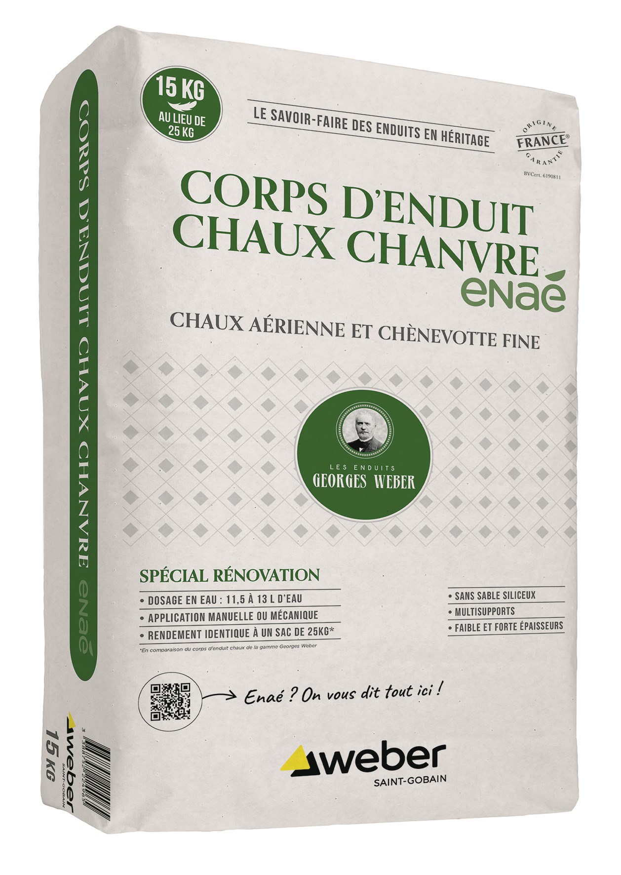 Après trois années de R&D, Weber lance le Corps d’enduit chaux-chanvre enaé. Ce produit innovant, formulé à base de chaux aérienne et de chènevotte fine, offre une solution de rénovation ultra-légère.