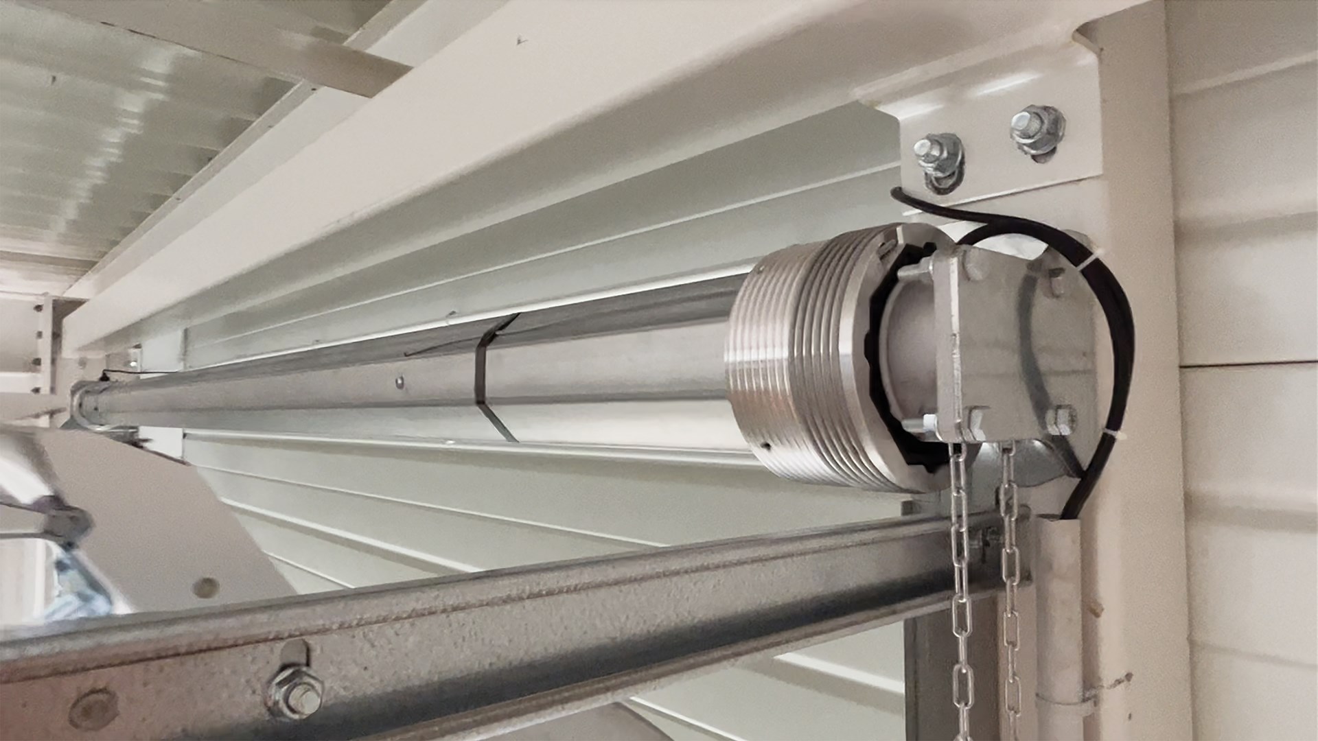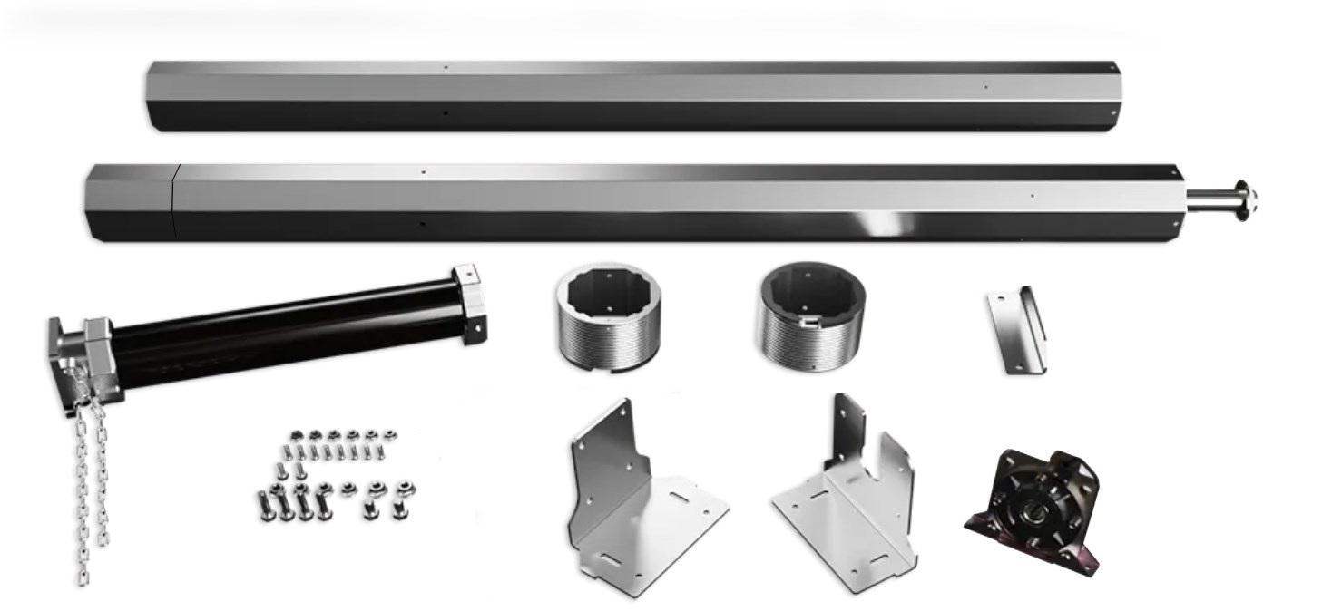 Le résultat : un axe autoportant galvanisé, recoupable sur site, combiné à un moteur tubulaire avec treuil de secours, des parachutes à inertie pour la sécurité, et des platines de fixation vissables. L’ensemble est modulaire, sans soudure, et compatible avec les levées standards, hautes ou verticales, avec ou sans pente.