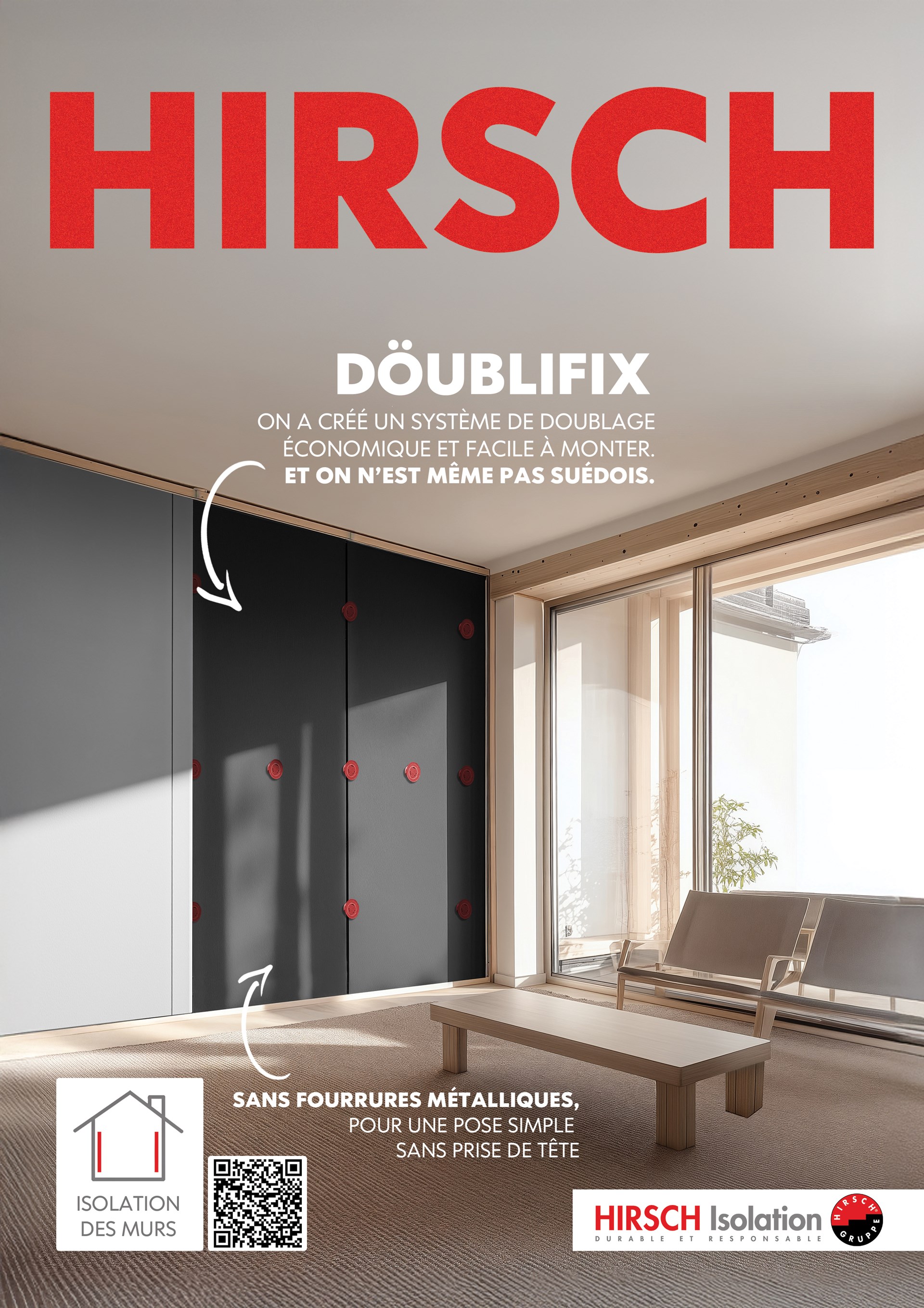 L’innovation Doublifix® réside dans l’association d’un isolant en polystyrène expansé HIRSCH Isolation, produit en France, et d’un kit de fixation développé en partenariat avec fischer. Le système est complété par des cornières, en haut et en bas, et des plaques de plâtre standards du marché. Contrairement à d'autres solutions proposées, le système de doublage de mur intérieur Doublifix® peut, en effet, être mis en œuvre avec les plaques de plâtre de différentes marques, d’une épaisseur minimale de 12,5 mm et bénéficiant du marque NF.