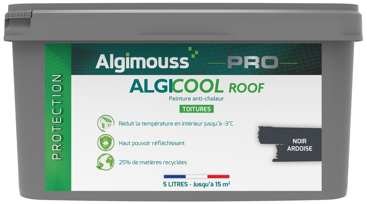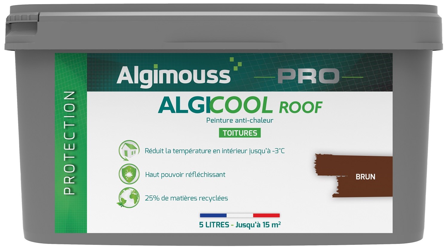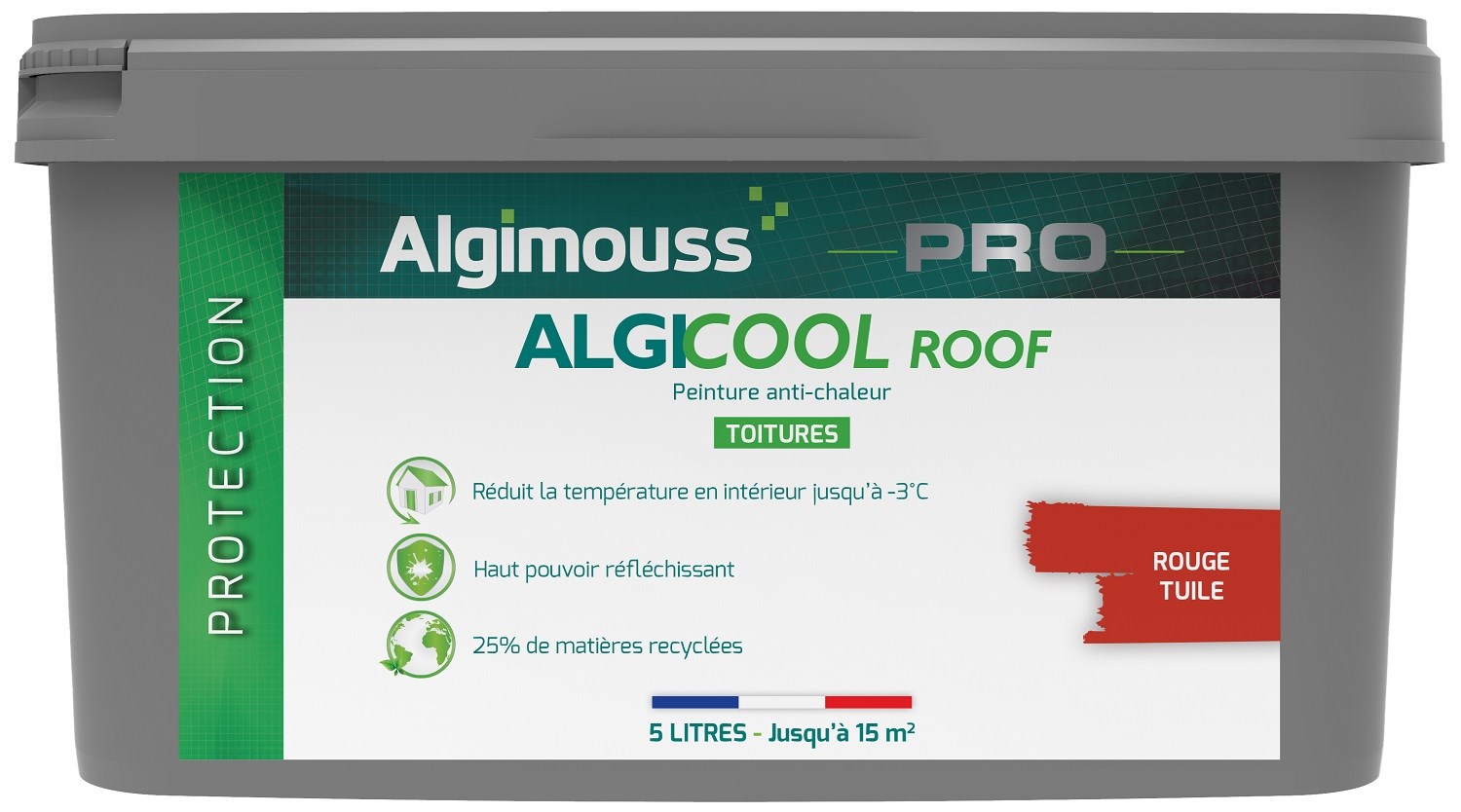 Algicool Roof est une peinture réflective colorée qui réduit la chaleur estivale sans altérer l’esthétique du bâtiment. Adaptée à la plupart des toitures, elle abaisse la température intérieure de 3 à 6 °C.