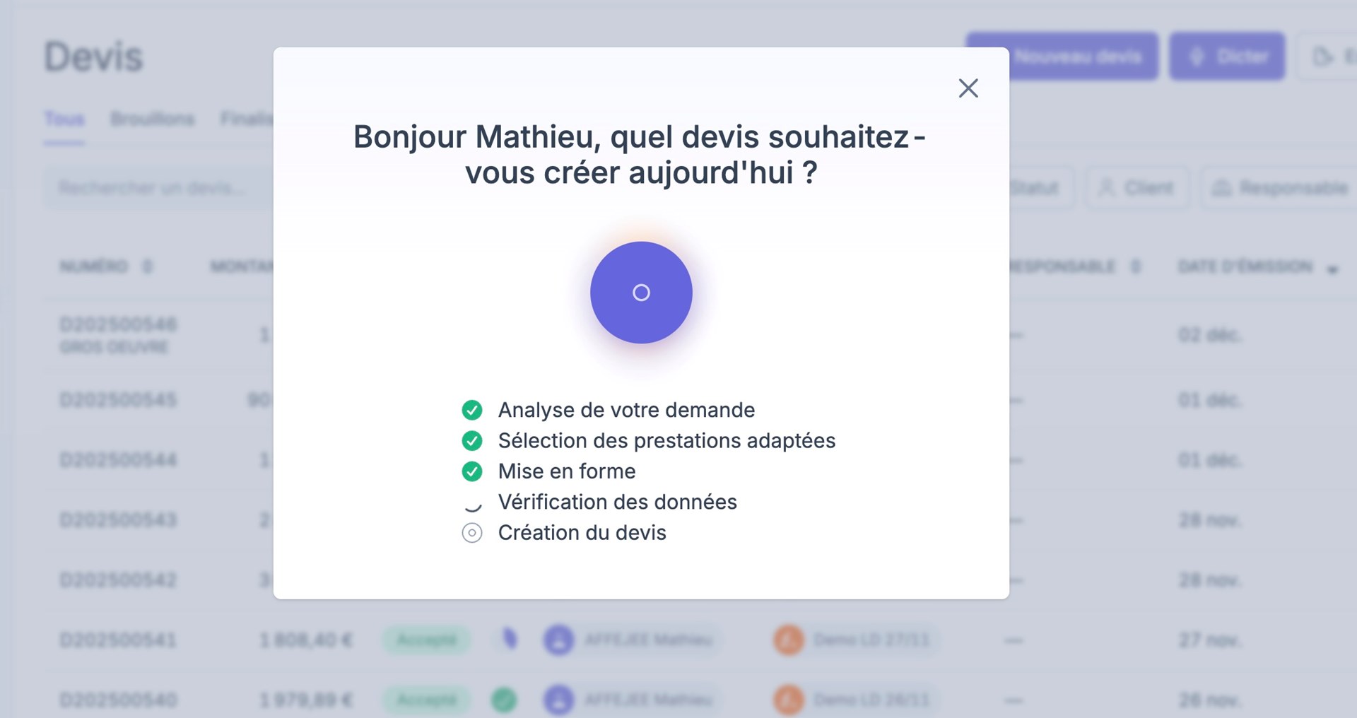 Le fonctionnement est simple : l’utilisateur dicte son devis à voix haute, comme s’il expliquait le chantier à un collègue. L’outil transcrit instantanément la dictée, comprend le contexte, identifie les postes, les quantités et les matériaux, puis génère une mise en forme claire et exploitable. L’IA enrichit automatiquement le contenu en proposant des descriptions complètes, des formulations professionnelles et des éléments souvent oubliés lors d’une rédaction manuelle. Le résultat : un devis propre, détaillé qui sert de base très complète pour que l'artisan puisse ajuster au travers de son expertise.