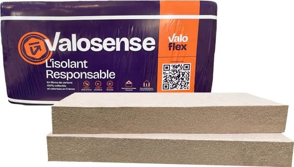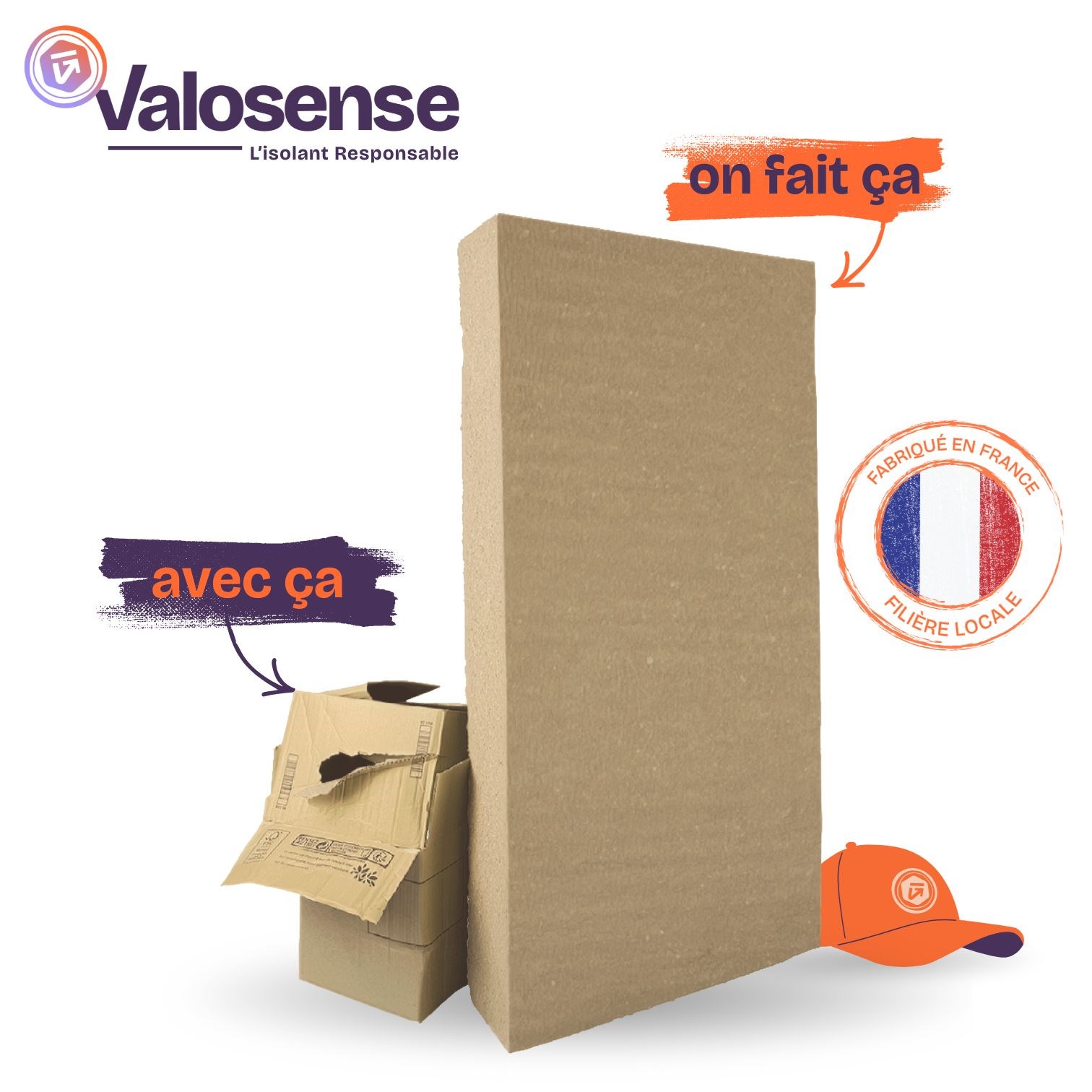 Valosense est un panneau isolant semi-rigide en fibres de cartons, 100% recyclés, fabriqué en France.