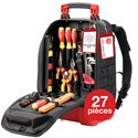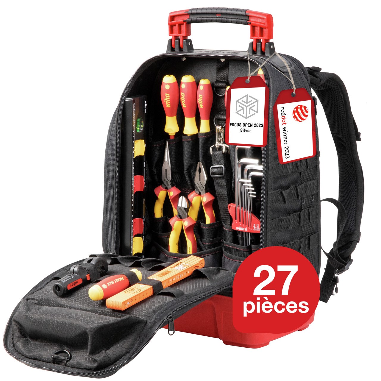 Le sac à dos Electricien Wiha est idéal pour les interventions en déplacement et offre une liberté de mouvement maximale. Les 77 possibilités de rangement et les 30 fixations supplémentaires permettent de le personnaliser avec d'autres outils et accessoires.a coque robuste, à la base du sac à dos, lui offre une position stable et lui permet de tenir tout le temps debout lorsqu'il est ouvert.Avec ce sac à dos d'outils professionnel et sa composition d'outils Wiha de qualité supérieure, vous avez toujours tout ce qu'il faut où que vous soyez!